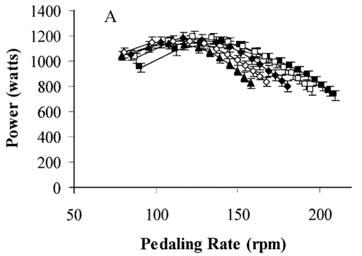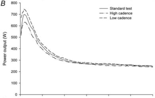Dus met bovenstaande tabel zal je met een gemiddeld vermogen van 550 watt uitkomen met een 6% torque factor. Met een 750 watt eerder een torque van 8,5%. Toch maakt het in onderzoek niet veel uit, onderstaand is voor iemand van 70 kg de torque factor 2,9% (piekcadans >200 rpm) en 11,4% (piekcadans 110 rpm), uiteindelijk is er <10% verschil voor piekvermogen, het gemiddeld vermogen is wel aanzienlijk later. In de studies zijn vond ik verschillen van 5,5% tot 8,4%. Waarschijnlijk zal het geen grote invloed hebben op het piekvermogen wanneer de piekcadans tussen de 120 en 180 ligt.