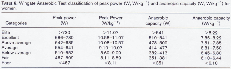 - Zupan MF, Arata AW, Dawson LH, Wile AL, Payn TL, Hannon ME. Wingate Anaerobic Test peak power and anaerobic capacity classifications for men and women intercollegiate athletes. J Strength Cond Res. 2009;23(9):2598-2604. doi:10.1519/JSC.0b013e3181b1b21b